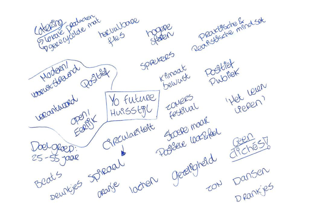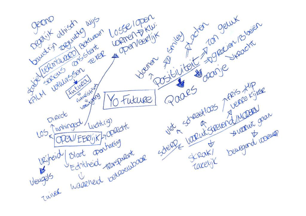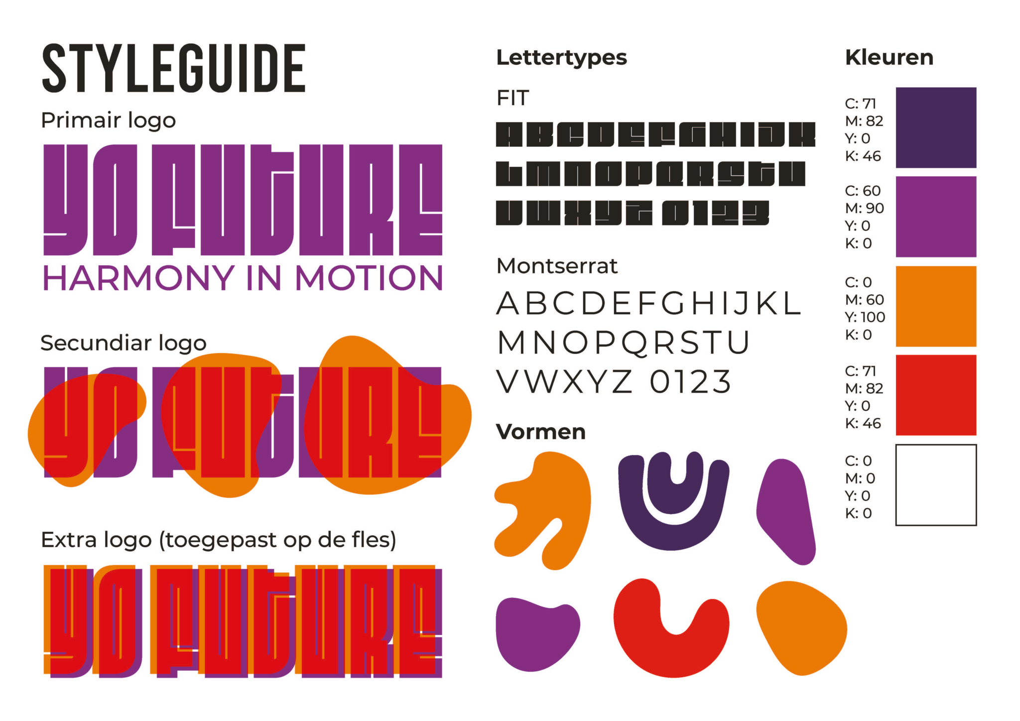 Binnen het ontwerpproces is gestart met een mindmap om deze kernwaarden te vertalen naar een visuele identiteit. Vooruitstrevend leidde tot een futuristisch lettertype (‘Fit’), open/eerlijk tot vrije en organische vormen, verantwoord tot dichte en solide vormen en positiviteit tot het gebruik van felle kleuren zoals paars en oranje.